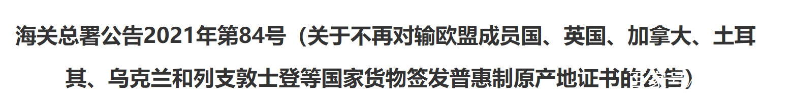 (关于不再对输欧盟成员国、英国、加拿大、土耳其、乌克兰和列支敦士登等国家货物签发普惠制原产地证书的公告)